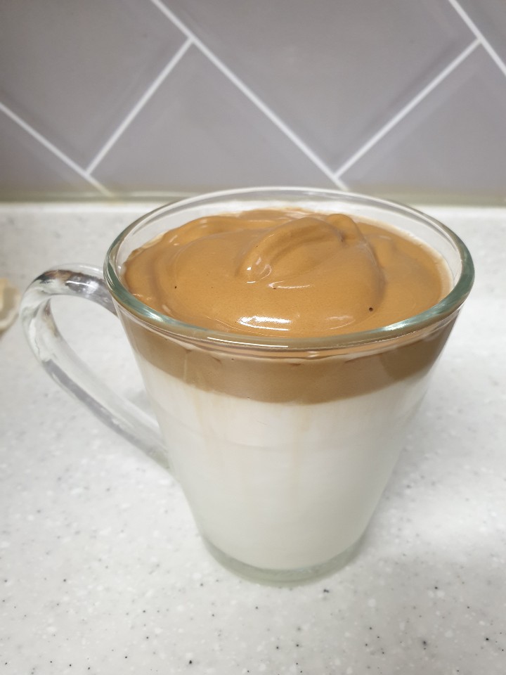 우유 위에 커피 휘핑한 것을 숟가락으로 떠서 우유 위에 살며시 올려줍니다^^ 너무 예쁘지 않나요?? 커피가 먹음직스러워요. 달고나 커피 만들 때 실패하는 이유는 커피 휘핑을 적게 해서 우유랑 썩여서 실패하는 것입니다. 그래서 휘핑을 잘해야 실패를 하지 않아요ㅎㅎ