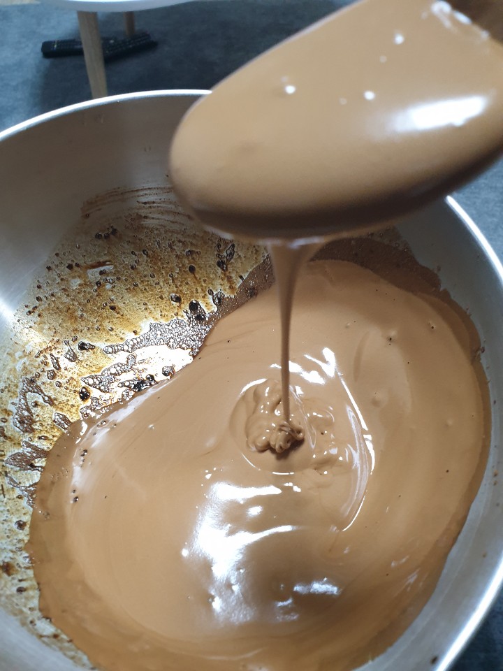 조금 더 젓다보면 진했던 커피색이 조금 더 연한 색으로 변해요. 숟가락으로 떠서 흘려봅니다ㅎㅎ 그랬을 때 형태가 어느 정도 유지된다면 달고나 커피 성공한 거나 마찬가지예요ㅎㅎ