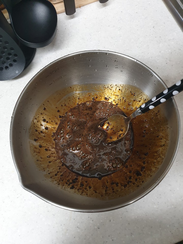 커피 1, 설탕 1, 물 1로 1:1:1 비율을 꼭! 지켜야 합니다 ^^ 저는 커피 4, 설탕 4, 물 4로 했어요. 그랬더니 달고나 커피 3잔 정도 나오네요. 커피는 카누 디카페인으로 사용 했어요. 다른 커피 사용 하셔도 됩니다^^